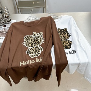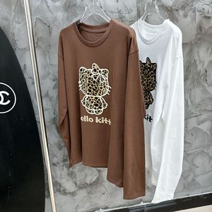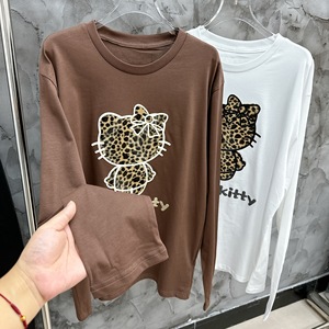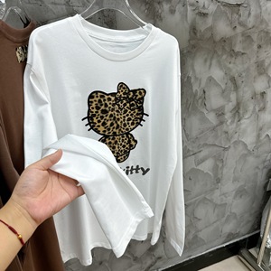 韩版休闲毛绒豹纹卡通猫中长款长袖T恤2025年秋季圆领长袖上衣女T