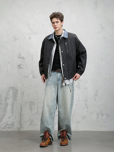 假两件牛仔拼接翻领外套男解构设计感cleanfit潮牌痞帅休闲夹克