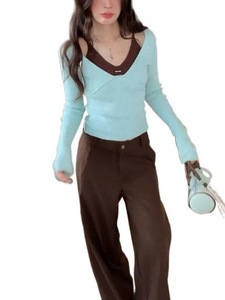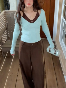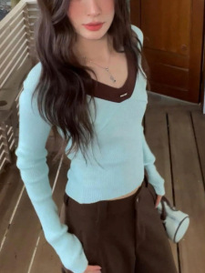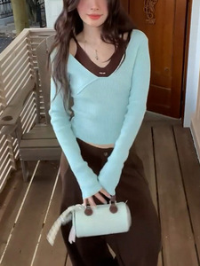 针织衫女秋季2025新款韩系气质薄荷色V领收腰修身短款长袖上衣T恤