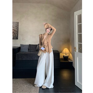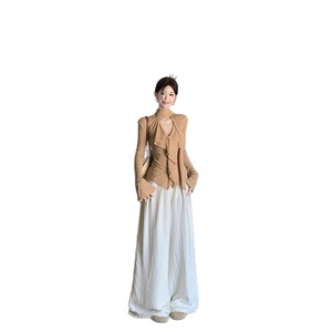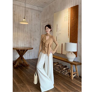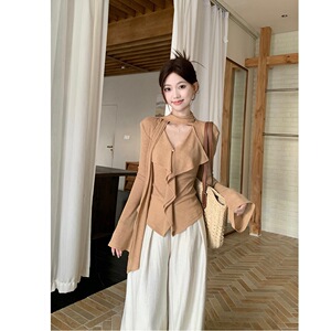 法式V领荷叶边飘带长袖t恤女2025衬衫新款松弛系小众修身掐腰上衣