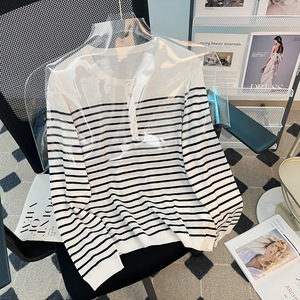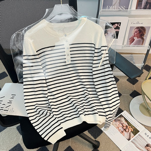 高品质!【加州天使】圆领单排扣条纹宽松薄款含绵羊毛针织衫上衣
