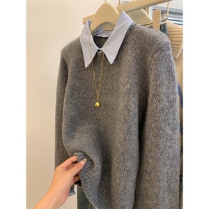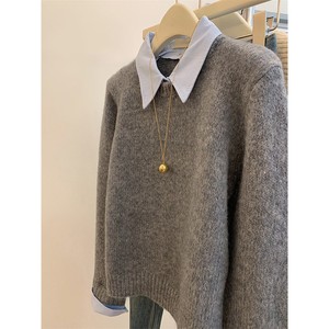 韩系衬衫领拼接套头假两件毛衣女装25年秋冬学院风针织衫显瘦上衣