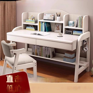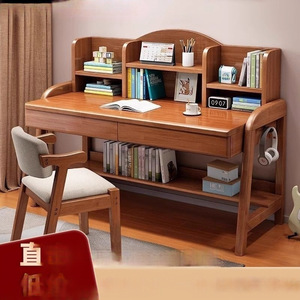实木书桌手动升降桌中学生书桌卧室家用简约书桌书架一体写字桌椅