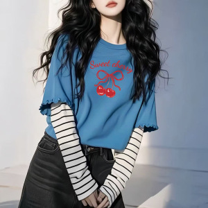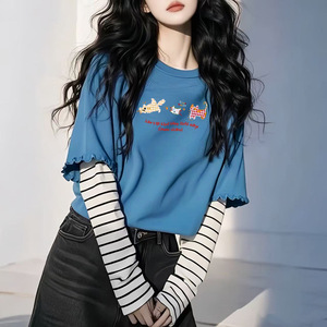 秋季新款假两件条纹长袖t恤圆领百搭显瘦印花宽松慵懒风打底衫女
