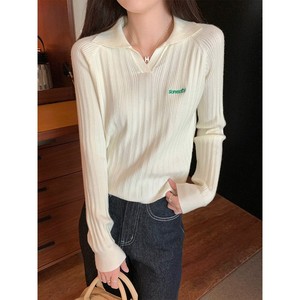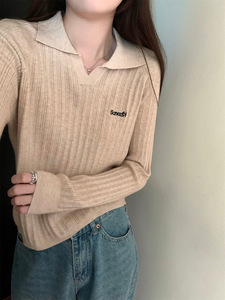 藏青色polo领针织衫女早秋季秋冬内搭打底衫薄款翻领针织上衣毛衣
