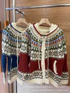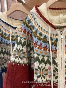 复古提花拉链连帽毛衣外套女秋冬2025新款宽松加厚针织开衫