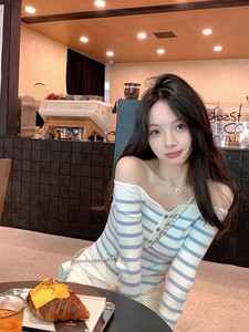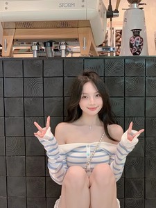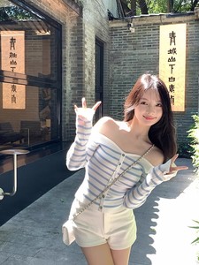 纯欲一字肩蓝白条纹长袖针织衫女秋季修身显瘦辣妹短款打底衫上衣