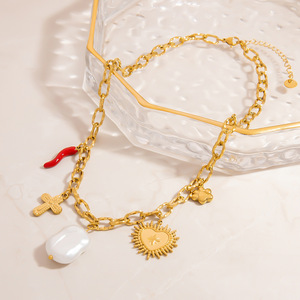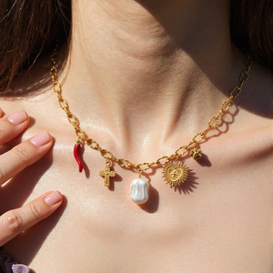 跨境不锈钢珍珠项链十字架饰品轻奢高级感镀18K金不掉色锁骨链女