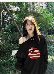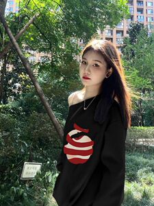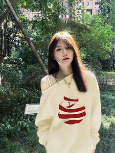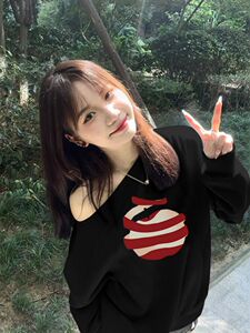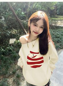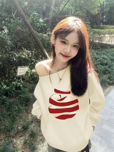 法式斜肩露肩白色苹果印花卫衣女秋季新款甜妹设计感小众宽松上衣