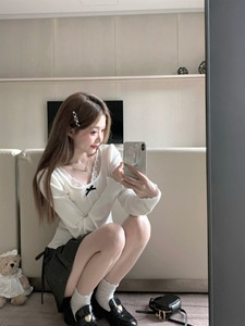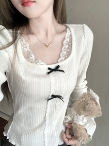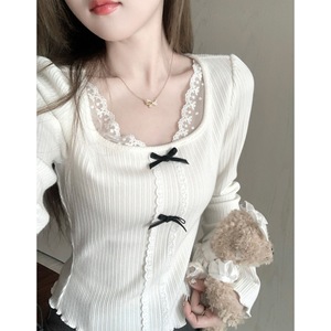 Q女家 赫丽日记/千金风针织长袖蕾丝上衣女早秋季白色内搭打底衫