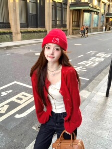 Q女家糯叽叽的初秋/红色羊毛麻花毛衣开衫外套针织巨好看早秋穿搭