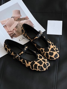 2025新款豹纹马毛女单鞋舒适row风一字扣带真皮浅口芭蕾舞平底鞋