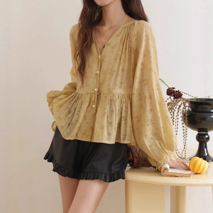 黄色暗纹印花衬衫女2025秋季新款灯笼袖抽绳收腰蕾丝花边上衣