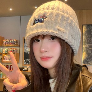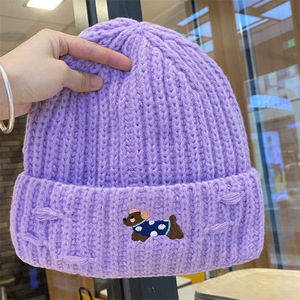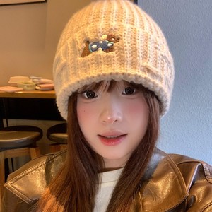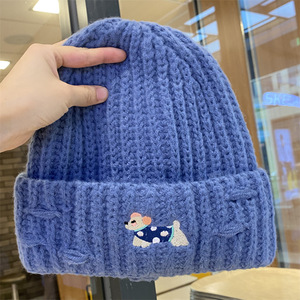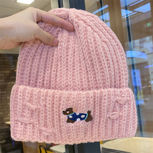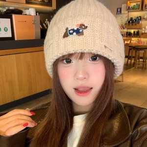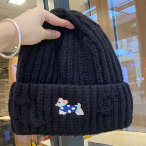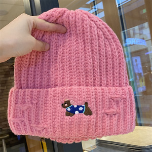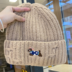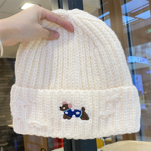 2025新款绣花小狗毛线帽女秋冬季护耳套头帽百搭保暖加厚针织帽潮