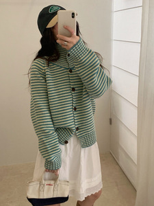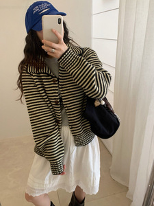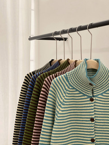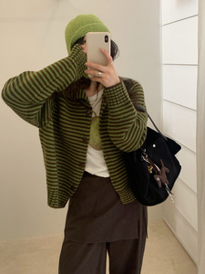 木四 韩版立领开衫毛衣女秋冬女装宽松撞色条纹针织外套上衣M6670