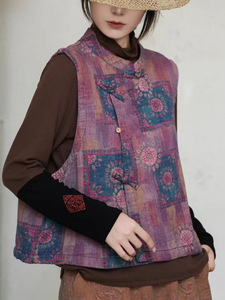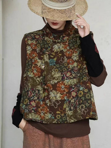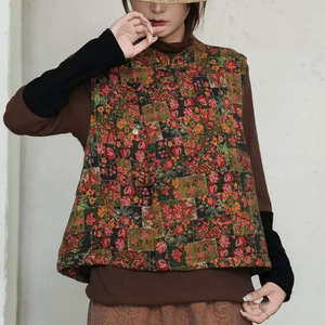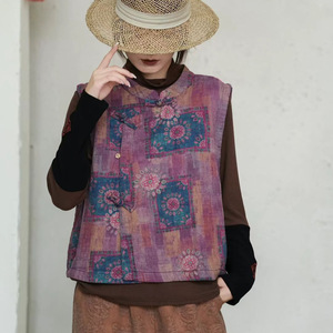 2025秋复古怀旧复古印花双层背心宽松文艺圆领斜襟马甲上衣