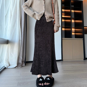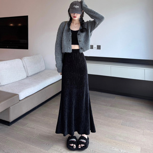 实拍 金丝绒压褶半身裙女秋冬高端黑色长裙子高腰文艺A字鱼尾裙