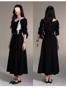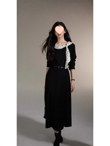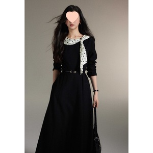 贰羊设计南艺法式气质波点飘带领拼黑色连衣裙女感收腰裙其他
