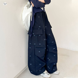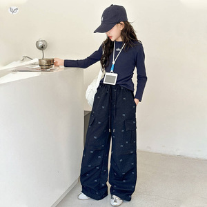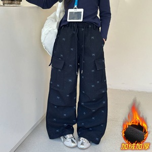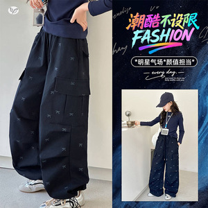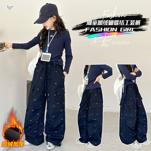 女童加绒长裤2025年秋冬新款中大童蝴蝶结工装裤休闲阔腿裤直筒裤
