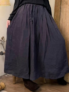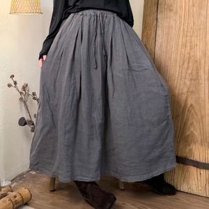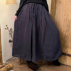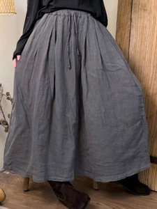 2025秋季新款双层亚麻半身裙女复古炒色 松紧腰系带宽松长裙