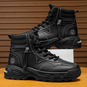 高帮男鞋秋季休闲登山运动防滑工装鞋皮面防水厚底增高白色马丁靴