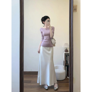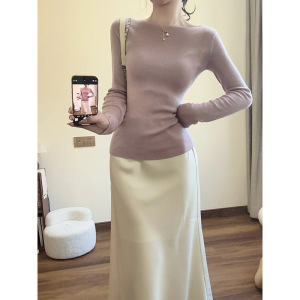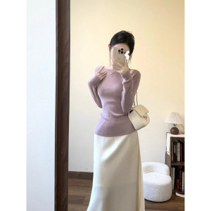 法式紫色一字肩修身羊毛针织衫女两件套温柔风打底毛衣高级感上衣