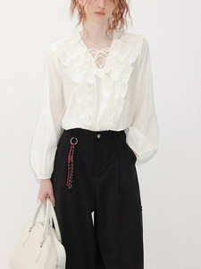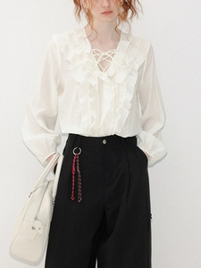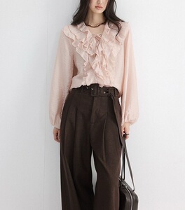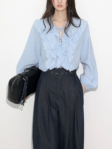 早秋氛围感粉色荷叶边衬衣上衣女法式高级感长袖V领衬衫