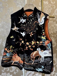 新中式重工刺绣鹿鹊报喜真丝丝绒马甲2025秋季复古叠穿盘扣上衣