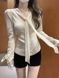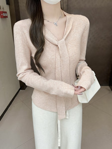 韩系v领飘带打底衫女春秋纯欲风内搭毛衣高级感围脖羊毛针织上衣