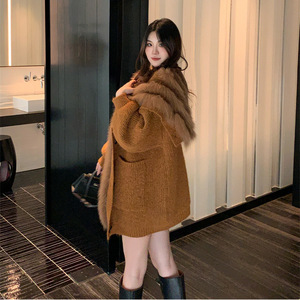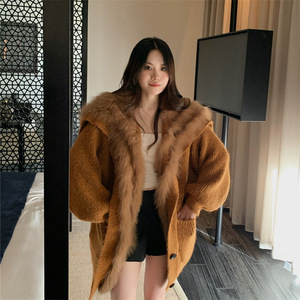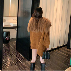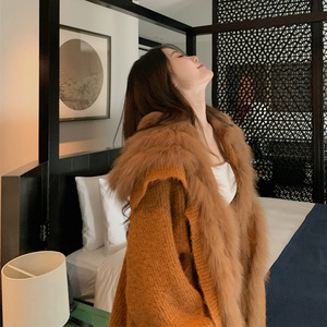 欧美跨境外贸秋冬新款狐狸毛领针织开衫毛毛外套慵懒风中长款上衣