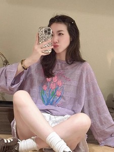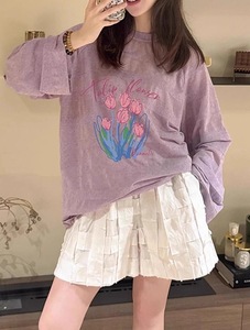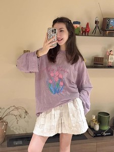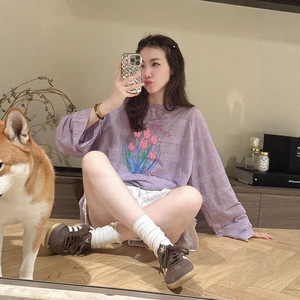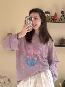 紫色印花圆领长袖休闲T恤女秋季韩系慵懒风外搭绝美减龄薄款上衣