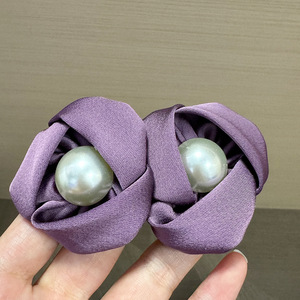 紫色缎面珍珠花朵耳钉