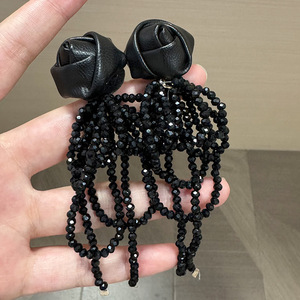 气质黑色皮革玫瑰串珠流苏耳钉
