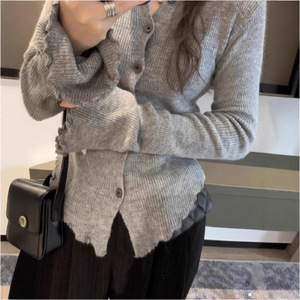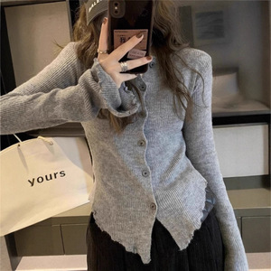 灰色不规则针织打底衫女新款设计感小众大码修身显瘦收腰内搭上衣