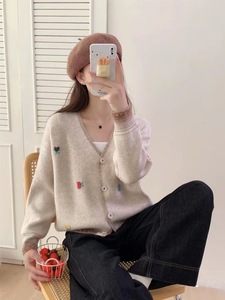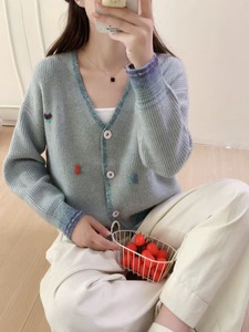 花朵毛衣女 2025秋新款文艺宽松休闲V领短款韩系甜美毛衣外套 507