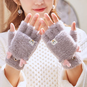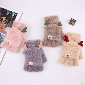 手套秋冬季加厚毛绒保暖手套女学生可爱鹿角半指翻盖针织手套批发