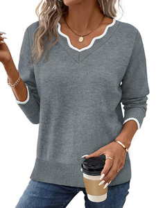 2025欧美亚马逊独立站新款女士V领针织可爱拼色毛衣套头衫爆款现
