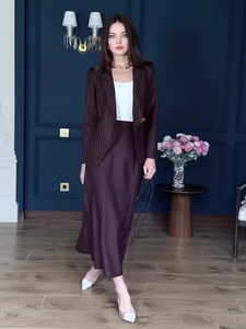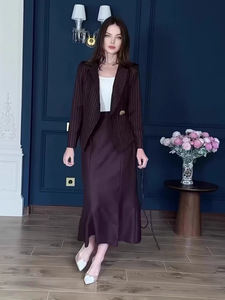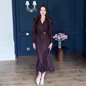 欧美跨境女装2025秋季新款气质翻领条纹开衫系带上衣高腰半裙套装