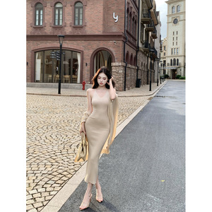 昕可达【江南美人】米色气质感斗篷披肩收腰显瘦挂脖针织长裙套装