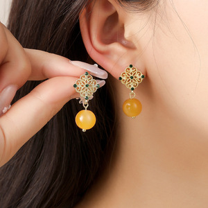 复古宫廷新中式仿蜜蜡珍珠耳环女高级感菱形花纹绿锆耳钉古风耳饰
