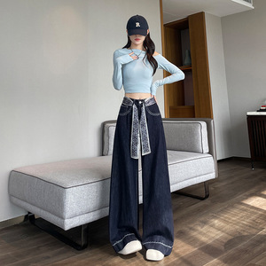 配丝带复古水洗牛仔裤女长裤春秋季辣妹高腰阔腿裤显瘦拖地长裤子