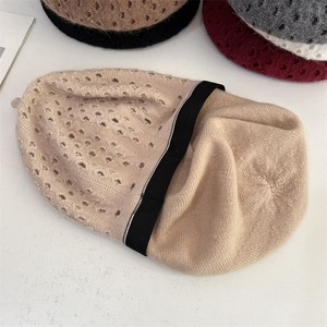 韩版兔毛和羊毛混纺洞眼双层针织贝雷帽女士秋冬文艺镂空画家帽子