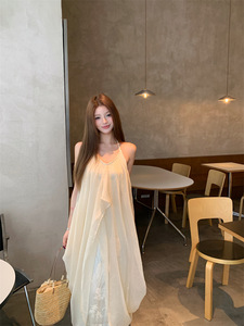 新中式复古V领挂脖吊带连衣裙女夏季不规则设计感小众气质长裙子