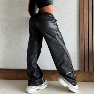 暗黑风拼色条纹设计松紧腰头潮流皮裤辣妹个性街舞酷帅直筒长裤