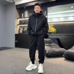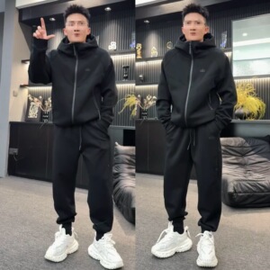 秋季潮牌纯色连帽休闲运动套装男高级感拉链外套束脚休闲裤两件套