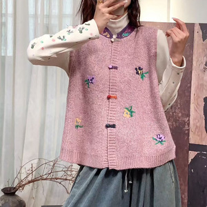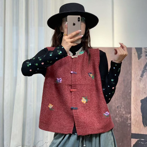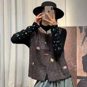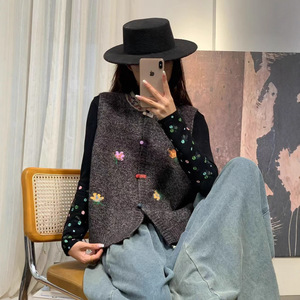 新品纽扣开衫撞色背心女复古文艺叠穿无袖针织马甲