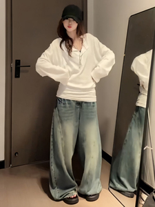 美式排扣v领蝙蝠袖白色长袖t恤女秋季松弛感宽松慵懒风设计感上衣