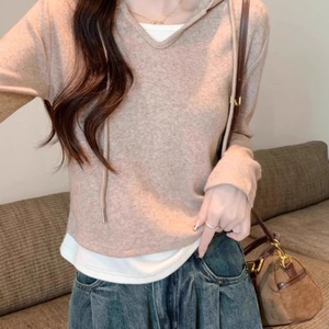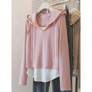 【仿羊绒】假两件连帽长袖t恤女秋装设计感修身打底衫内搭上