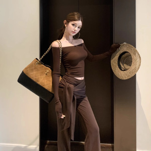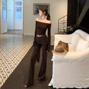 实拍 !感一整套春秋季气质一字肩长袖上衣休闲长裤针织套装