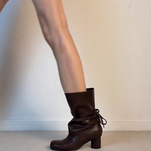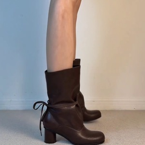 全羊皮~高跟系带短靴秋冬新款真皮时装圆头粗跟堆堆靴短筒靴踝靴